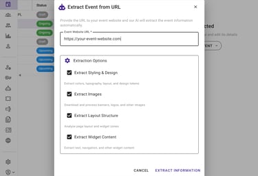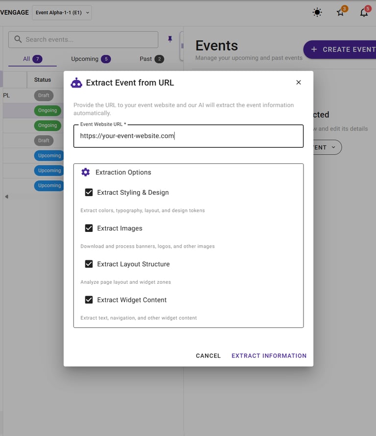 Whether you have a finished website or just an idea, Evengage helps you launch fast. Paste your site to auto-generate assets — or build everything from inside the platform.